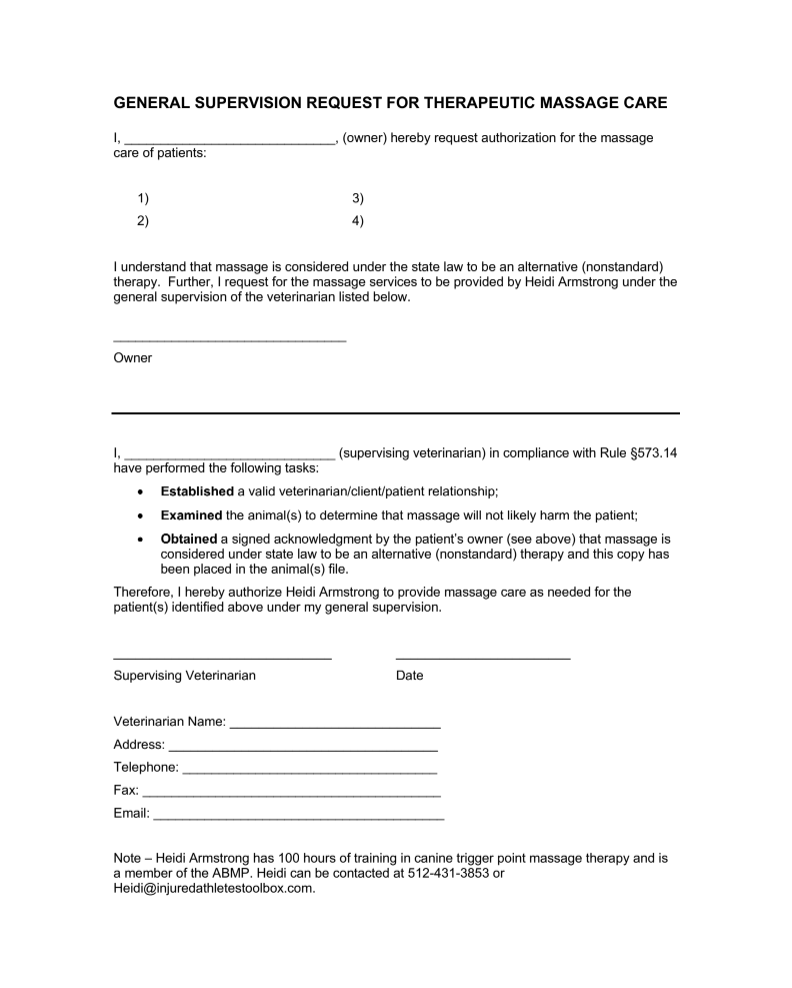 A veterinary supervision form must be signed by you and your veterinarian prior to your appointment.